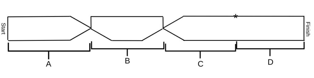 Step 1: Arrange the work as shown. Section D runs horizontally, Section C crosses over from the bottom left to the top right, Section B runs horizontally and parallel to D, and Section A crosses over from the top left to the bottom right.