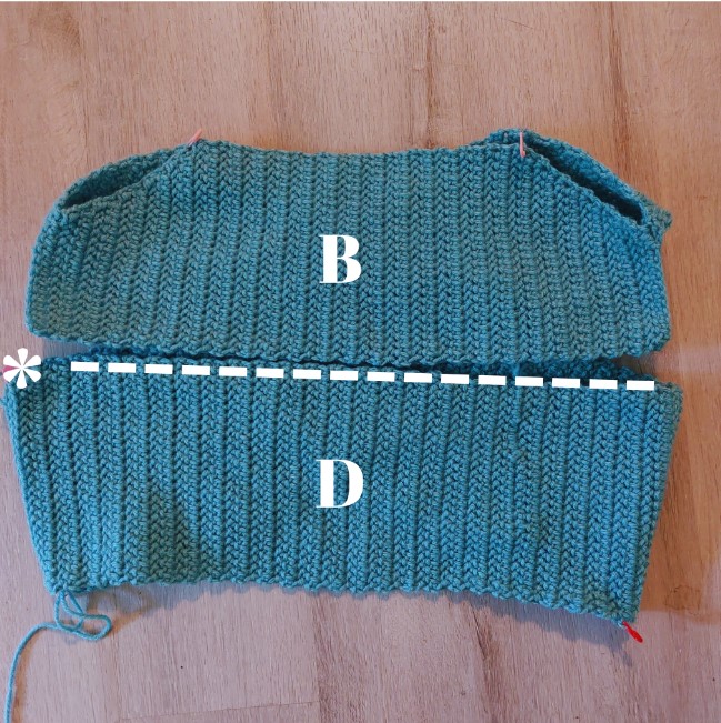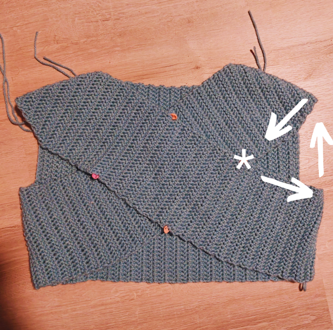 Continue to sc along the side of Section A. When you get to the stitch marker indicated by an asterisk, work one sc through both layers of fabric (skip this if you would like a wider neckhole). Working in the direction of the arrows and going through just one layer, evenly sc around the neckhole until you get back to the stitch marker. Work one more sc through both layers (or skip again), ch 1, turn, and continue to the next part without fastening off.