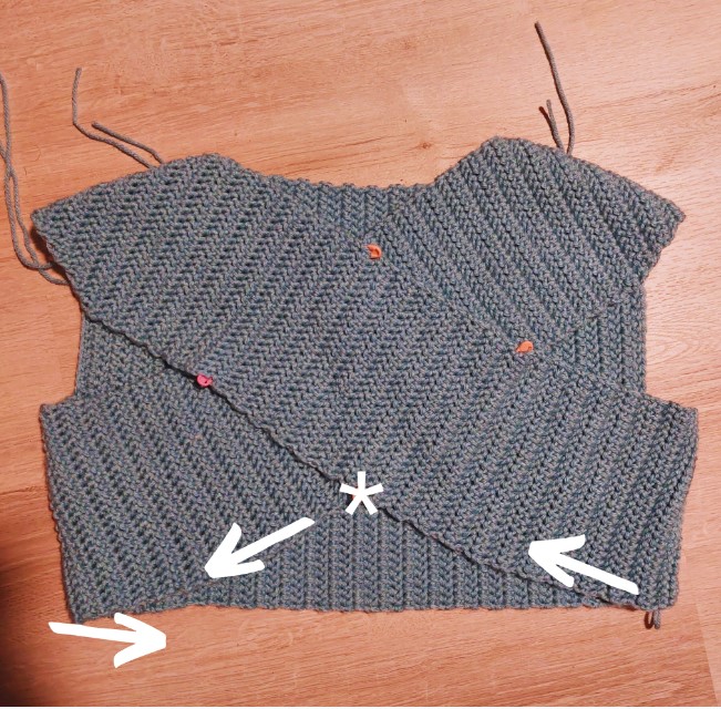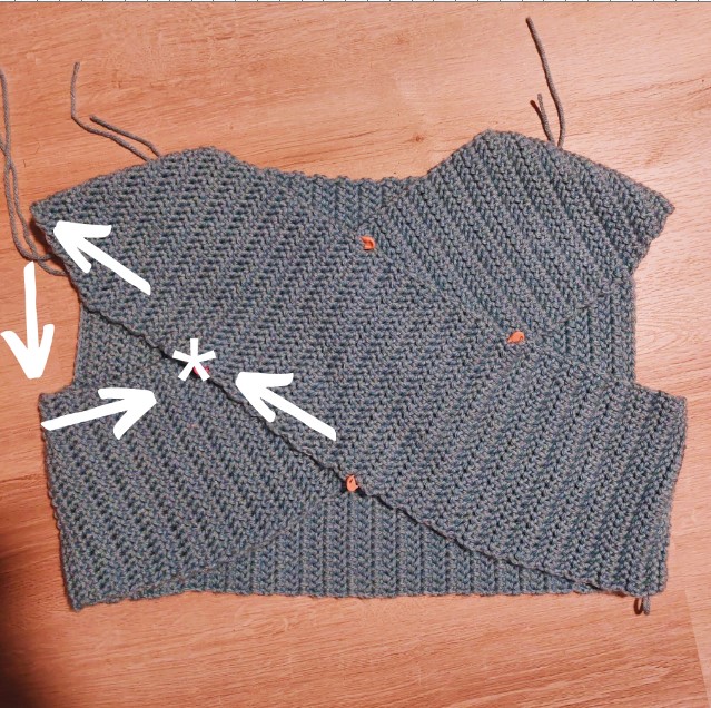Step 7: Continue to sc along the side of Section A, sc once through both layers of fabric when you get to the stitch marker indicated with an asterisk. Continue going through just one layer and sc around the armhole working in the direction of the arrows until you get back to the stitch marker. Work one more sc through both layers, fasten off, and weave in ends.