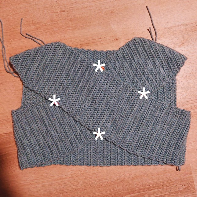 Step 5: Flip the piece back over to the front and attach 4 stitch markers as indicated by the asterisks. Go through both layers of fabric when you place the stitch markers so it holds them in place. I found it easiest to do this while wearing the piece. If you feel like the neckhole is too small with the topmost stitch marker in place, you can skip that one. I found the neckhole on mine to be a bit snug but I did appreciate the extra coziness.