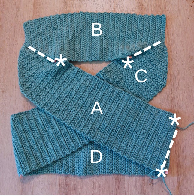Step 4: Keeping Section A facing you, fold Section B down and away from you to tuck it underneath the crossed pieces. Flip the piece over and line up the flat side of Section B with the center of Section D (you may have more stitches in Section D than in Section B). You’ll be able to tell where Section C ends and Section D begins thanks to that stitch marker we placed earlier. Sew or crochet the two edges together.