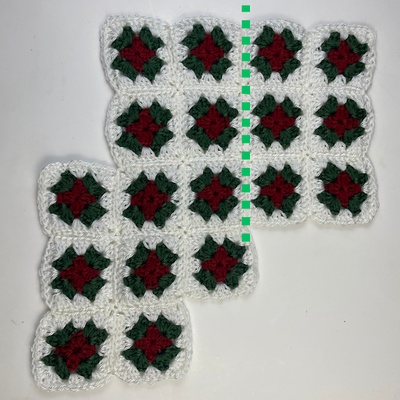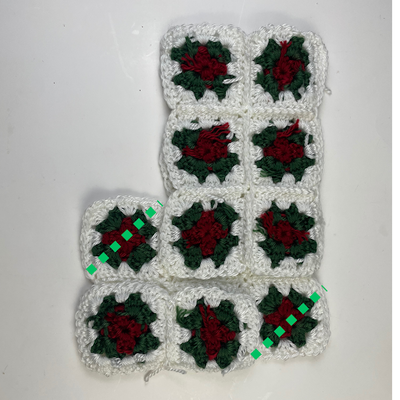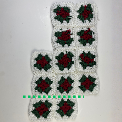 The squares are sewn or slip stitched together following the layout shown in the diagram below & video tutorial. Once all squares are joined, the panel is folded to form the shape of the stocking. If you’ve never built a stocking from squares before, don’t worry—the video shows exactly how to fold and seam your panel into shape. (video 9:15)