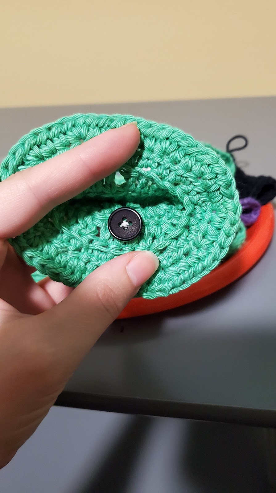 Sew a button inside of each hat, just above the ridge created by round 7 when we only worked through the front loops. I put my button over the seam because this will be the back of the hat.