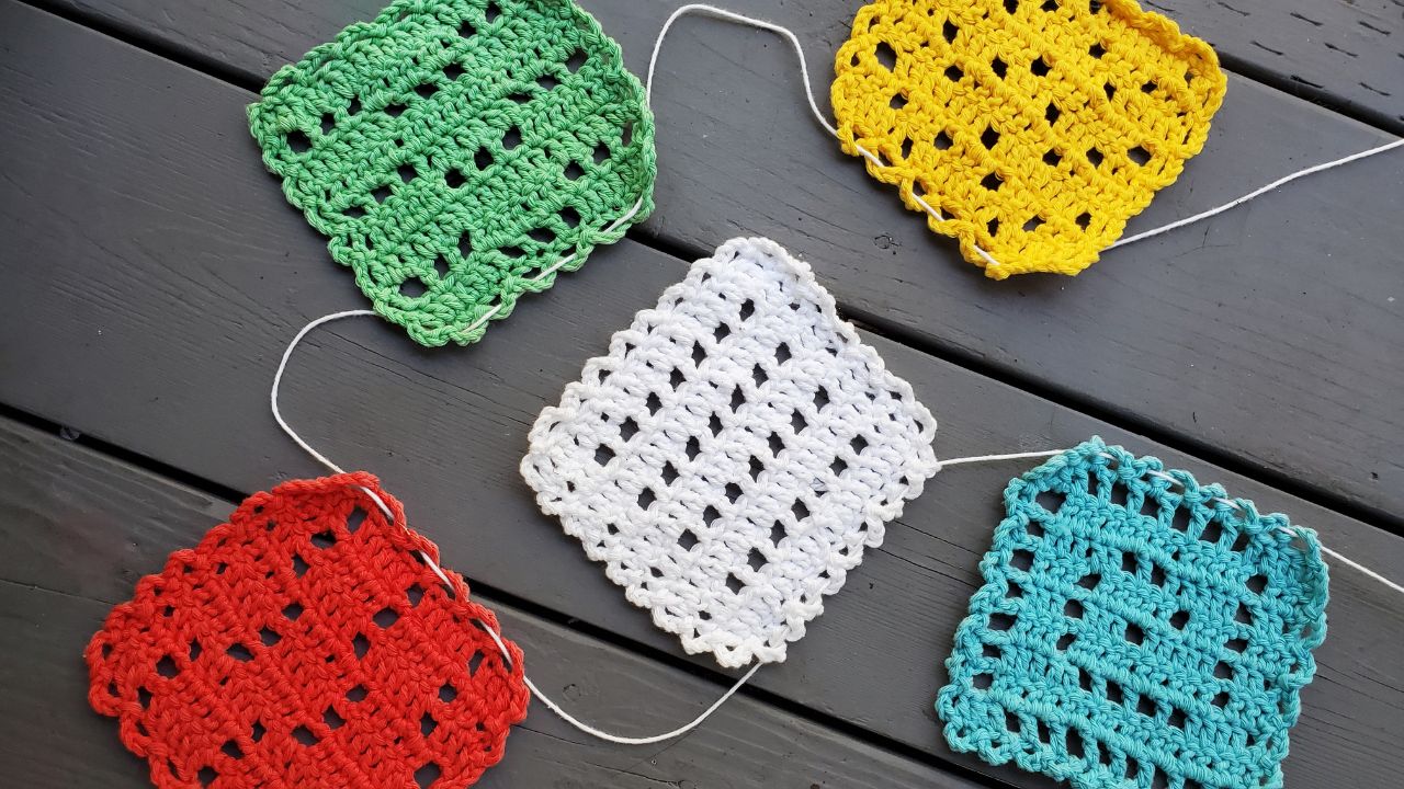 Make two of each square. When you complete the final row of a graph, continue to work around the square without cutting your yarn to make the border. To attach the flags to your hanging string, simply weave the string in and out of the border. Tie slip knots at either end of your hanging string so you can adjust it to your liking.