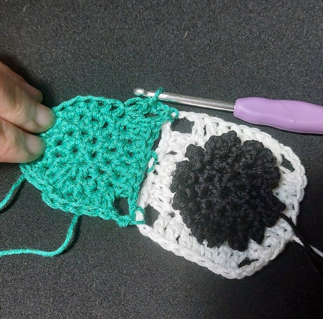 Make another subsequent square, following instructions for rounds 1-3b. In order to attach it on two sides as shown, follow the alternate directions for Round 4 (below).