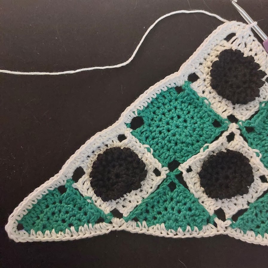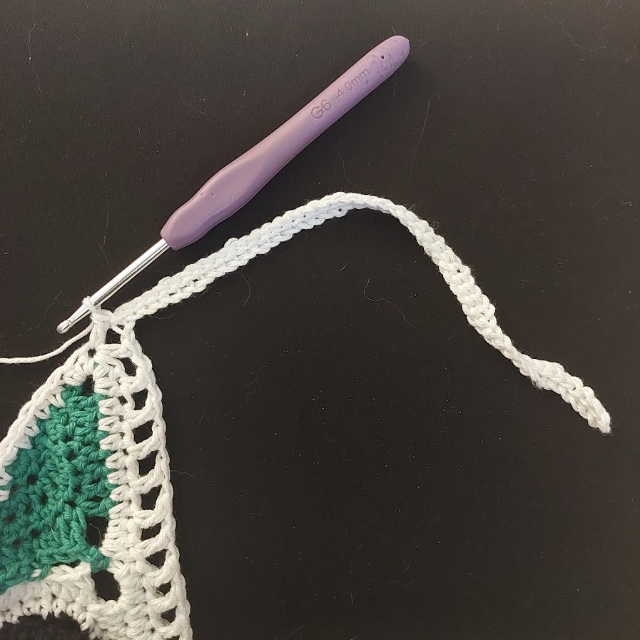 With 4 mm hook and white yarn, attach yarn in the bottom corner ch-sp.